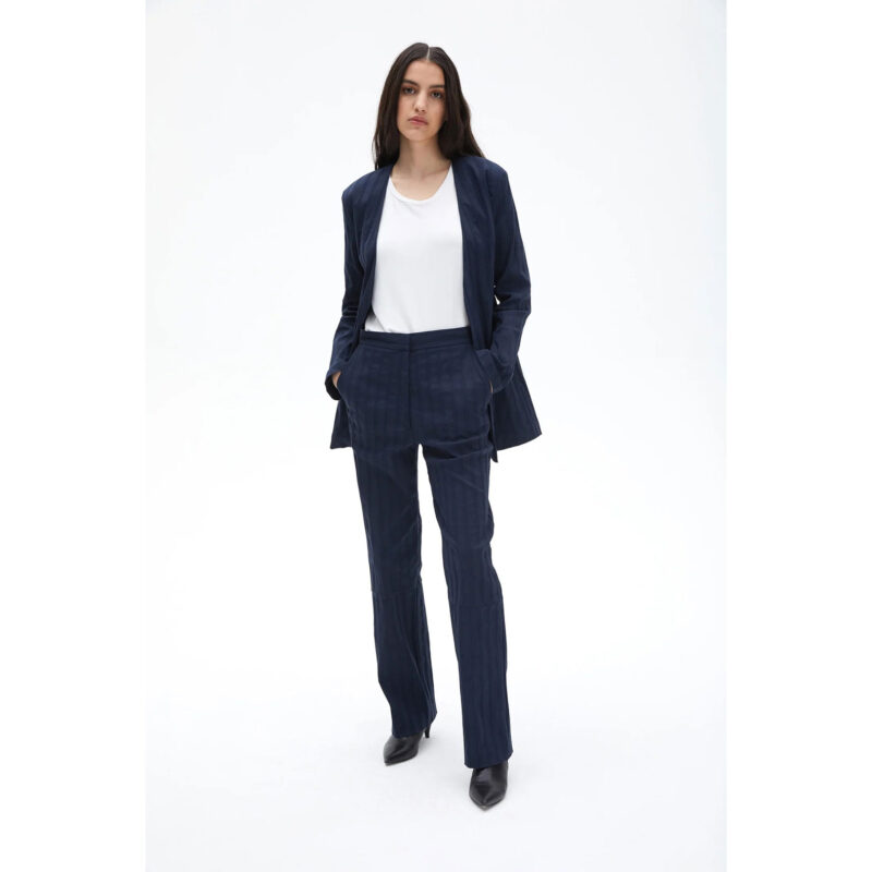 These pants are made from cotton mix fabric. They have a mid waist, side and back pockets, detailed cutline under the knee and a straight oversize silhouette. Wear it with a matching dark blue Gaza blazer for Ennos summer look.
