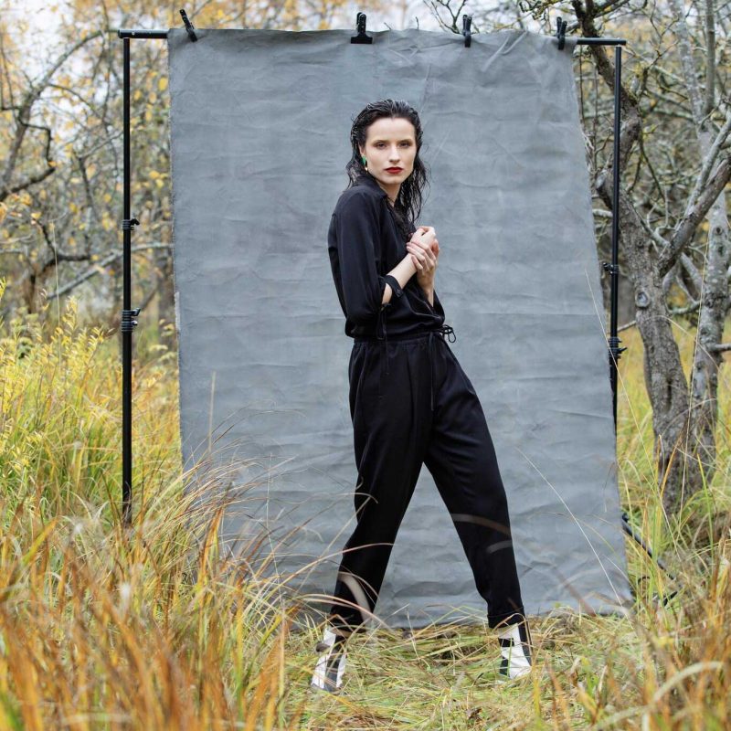 Mustad või kahvaturohelised avarad püksid. Värvli sees kumm ja nöör. Taskutega. Pikkus pahkluuni. Allääres tagasipööratud detail. (Modelli pikkus fotol 176cm) Tehtud pehmest hästi langevast mitte kortsuvast veidi venivast mustast kostüümikangast või helerohelisest paksemast viskoostrikotaažist. Masinas pestav.